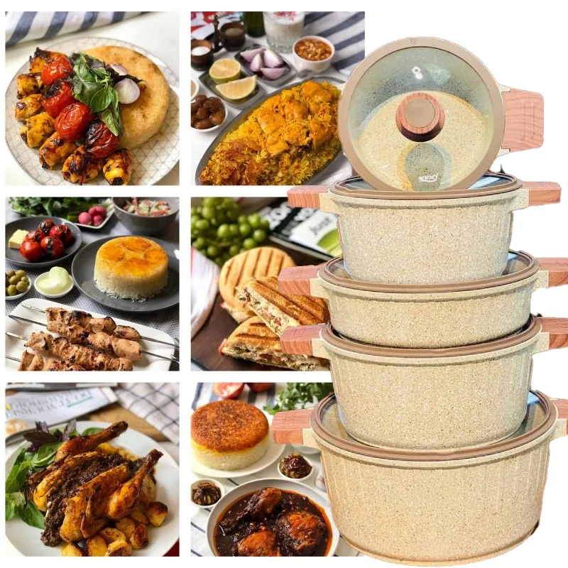روکش گرانیتی پنج لایه نچسب سرویس قابلمه آریمو مدل 1290 باعث می شود هر غذایی بدون چسبیدن آماده شود و پخت راحت تر و لذت بخش تر شود. وقتی درب قابلمه را بر می دارید بخار گرم و عطر غذای تازه فضا را پر می کند و حس رضایت به شما منتقل می شود. بدنه آلومینیومی 98.5 درصد حرارت را سریع و یکنواخت پخش می کند و غذا را به طور کامل می پزد.