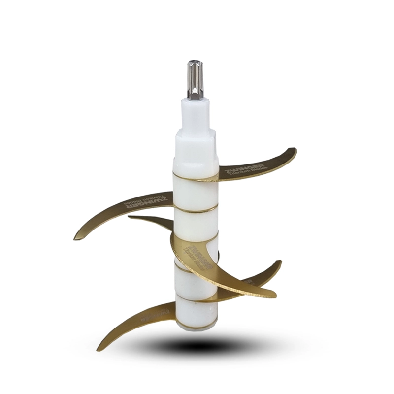 - تیغههای تیتانیومی با طراحی ششپره: دو تیغه مجزا از جنس استیل ضدزنگ با روکش طلایی دارد. طراحی ششپره این تیغهها باعث میشود موادی مانند گوشت، یخ یا حتی سبزیجات سفت به خوبی خرد شوند، بدون لهشدگی یا باقیماندههای درشت.