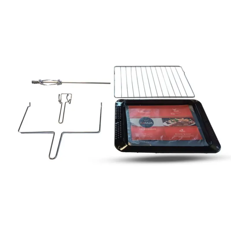 این دستگاه با سینی پخت و پز، قفسه کباب، سینی مخصوص پیتزا، انبر و سینی چربی‌گیر عرضه می‌شود تا نیازهای مختلف شما را در آشپزی پاسخگو باشد.