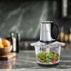 - مخزن شیشهای ۳ لیتری: ظرفیت ۳ لیتر یعنی فضای کافی برای خرد کردن حجم زیادی از مواد در یکبار استفاده. این ویژگی برای پخت غذاهای خانوادگی یا مهمانیها بسیار کاربردی است. جنس شیشهای مخزن نیز نهتنها جلوه زیبایی به دستگاه داده، بلکه شفاف بودن آن امکان مشاهده روند خرد کردن را هم فراهم کرده است. شیشه مقاوم در برابر ضربه و حرارت، استفادهای ایمن و طولانیمدت را تضمین میکند.